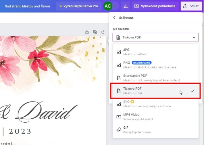 Upozorňujeme opět, že jde o návod pro laickou veřejnost - kdo má verzi Canva Pro, nastaví ještě u tiskového PDF barevný profil CMYK, ale většina uživatelů používá pouze základní verzi a tam to možné není.