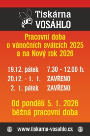Na konci roku 2025 budeme mít otevřeno do pátku 19. prosince do 12.00 hodin. Od 20. prosince 2025 budeme mít zavřeno. Těšit se na Vás zase budeme po novém roce, a to od pondělí 5. ledna 2026 v běžnou otevírací dobu.